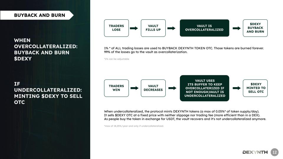 If there is more USDT in the vault than liquidity providers have deposited , the vault is "over-collateralized". During periods when dUSDT vault is over-collateralized, a percentage of ALL trading losses go into a pool that can be used by anyone to sell their $DEXY tokens via OTC.